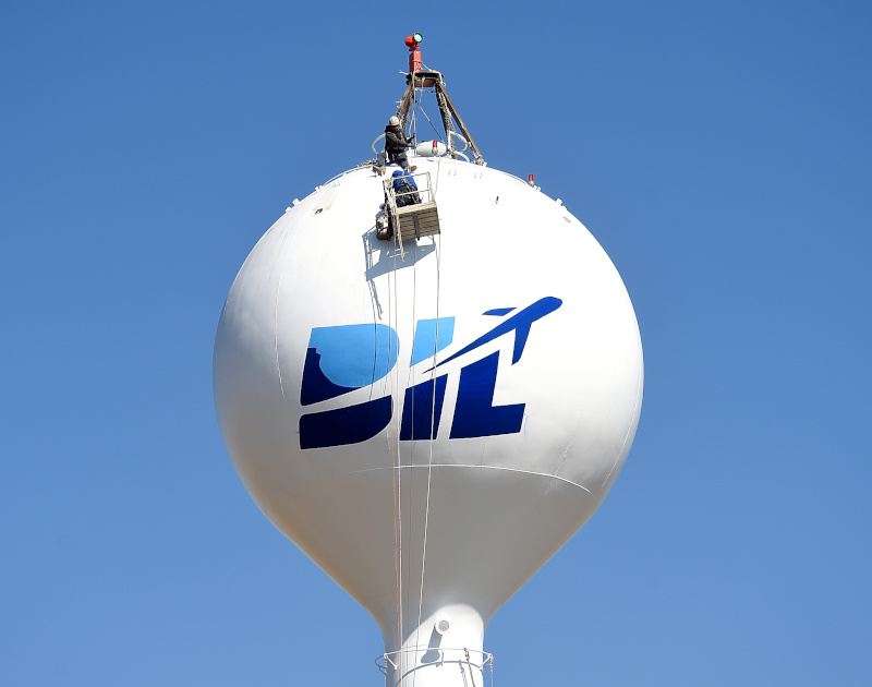 The repainted Billings airport water tower, long painted in a checkered pattern, is now all white with the airport identifier logo.
