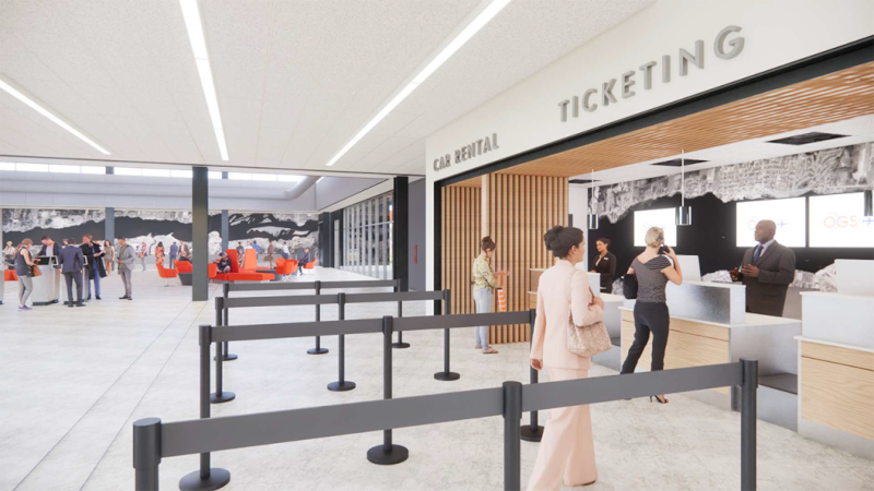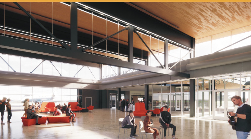 The project will include a new, multi-purpose great room to provide much-needed space for civic gatherings, conferences, business meetings, and other public events in a building that hasn’t been updated since the airport’s construction in 1980. Other improvements include: expansion of the lobby for check-in, ticketing, and baggage drop; additional restrooms; expansion of the screening, concession, and baggage claim areas; upgraded security doors and cameras; new water sprinklers; upgraded Wi-Fi; new sanitation and water fill stations; upgraded disinfection treatment within the HVAC system; an extended entrance canopy with an elongated curbside drop-off/pick-up area; an outdoor courtyard with tables, chairs, and planters; solar panels and electrical passenger vehicle/equipment charging stations; safety improvements for passengers walking between the plane and terminal building; and a renovation of the building’s façade.